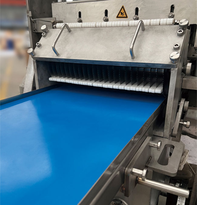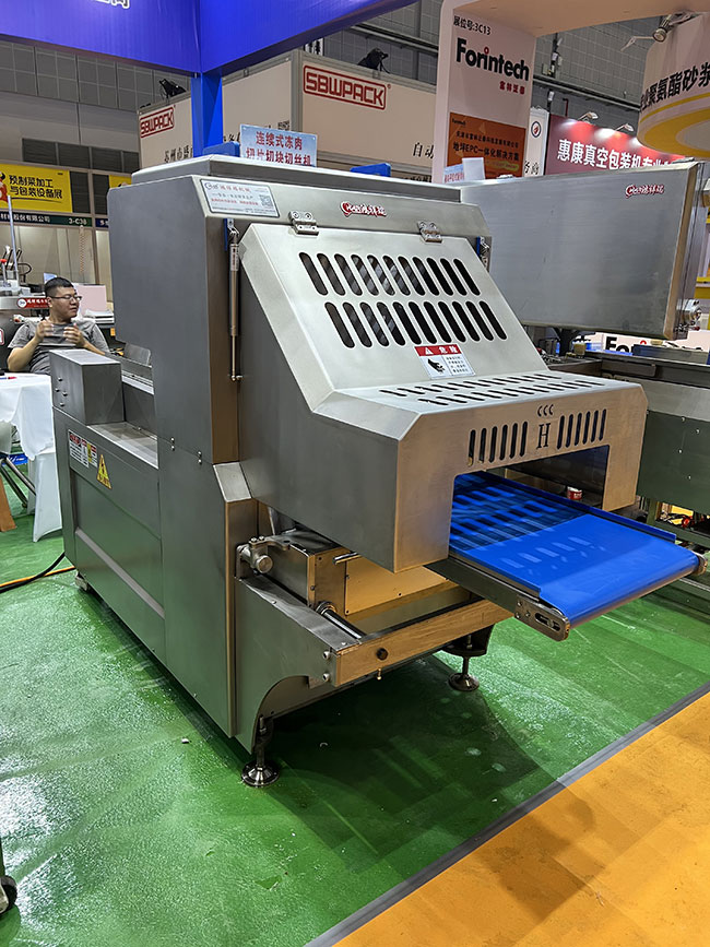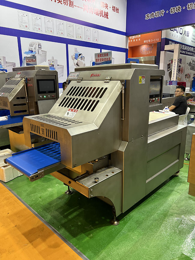 本產(chǎn)品在連續(xù)式切片機(jī)基礎(chǔ)上增加圓形刀組,組成二維切割形式,實(shí)現(xiàn)凍肉切丁切塊功能,連續(xù)式入料切割,流暢切割出成品肉丁肉塊,切塊切丁產(chǎn)量可達(dá)到2-3噸/小時。整套刀組均采用進(jìn)口材質(zhì)刀片,特殊齒形設(shè)計,使切割更加流暢,成型更加美觀。