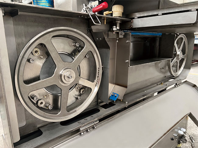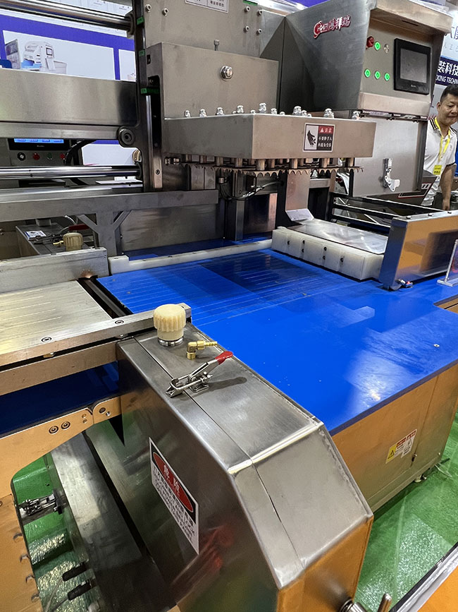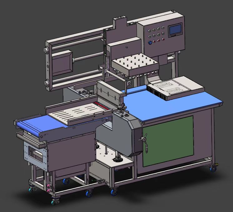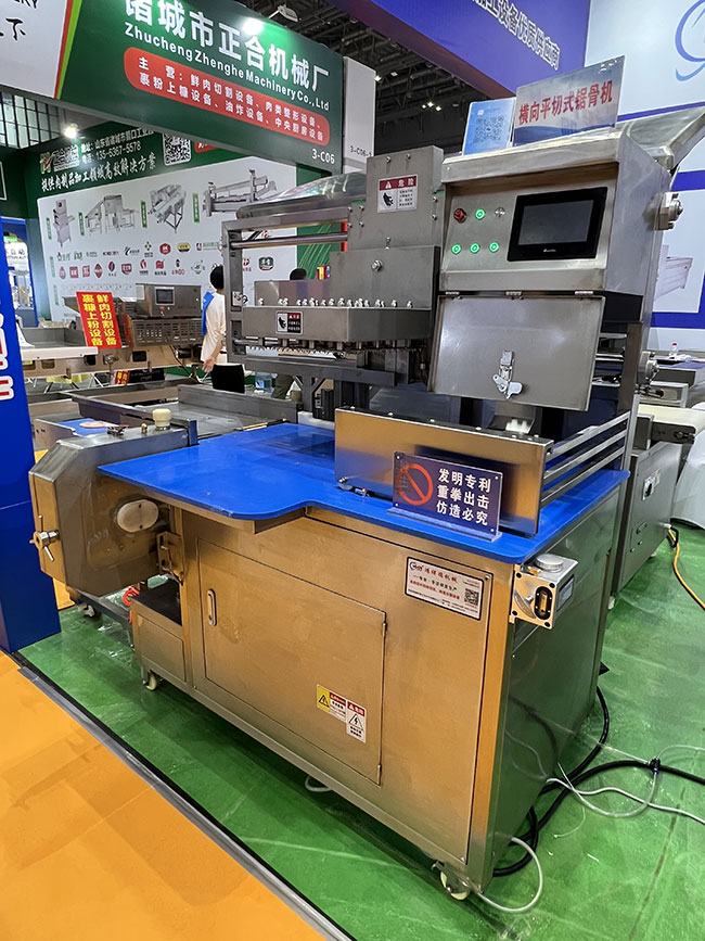 橫向平切式凍肉(骨)開片機(jī),是我公司按照市場需求精心研發(fā)的一款骨肉類深加工切割設(shè)備。本設(shè)備已榮獲國家發(fā)明專利(專利號:202310105353)。本設(shè)備采用鋸切的方式和橫向結(jié)構(gòu),可以將﹣20℃的凍肉、骨等食材鋸切成為均勻平直且最大橫截面的片,可以極大提高后續(xù)切塊、切絲、切片等工序的成品率和成型率。本設(shè)備采用氣電組合的動力結(jié)構(gòu),整機(jī)設(shè)備由主機(jī)和氣動升降夾料輸送帶組成,放入食材原料后無需人工干預(yù),氣動壓料,自動往復(fù)鋸切傳輸,極大提高了工作效率,保證了工作人員的安全性。開片厚度可以根據(jù)用戶需求數(shù)控調(diào)節(jié),方便快捷。整機(jī)采用SUS304不銹鋼材質(zhì),工作完成后可用高壓水槍直接沖洗和消毒處理。本設(shè)備適合用于超低溫凍肉、骨類切割,例如:冷凍大塊部位牛肉、大塊部位豬肉、調(diào)理組合禽類、脊骨、扇子骨、冷凍鱈魚等硬質(zhì)食材的橫向開片。外觀美觀大氣,是食品加工企業(yè)及食品深加工車間的優(yōu)秀選擇!